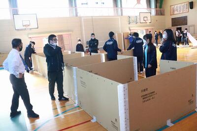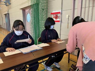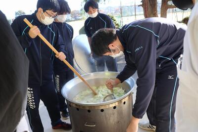 令和5年11月16日(木)に防災訓練が岩沼高等学園キャンパスさんと合同で行われました。今回は避難後の訓練として、川崎校は炊き出し訓練を、またキャンパスさんと協働で避難所設営を行いました。川崎町福祉課と社会福祉協議会からご飯を炊く防災釜と豚汁を作るための防災鍋を借用しました。炊き出し訓練では、ご飯と豚汁を全校生徒64人分とドリームの郷から避難してきた想定の方々20人分用意するという課題のもと、町職員の指導を受けつつも、教員の力は借りずに、生徒たちだけで挑戦しました。お米33.3合(5キログラム)を炊くための水加減や火起こしをしたり、段ボールでプライベート空間や更衣室、ベッドを組み立てたりと自分たちで考えて行動しました。そして出来上がり後には、配膳という運営までを行いました。川崎町ボランティア友の会の皆様の協力にも感謝します。