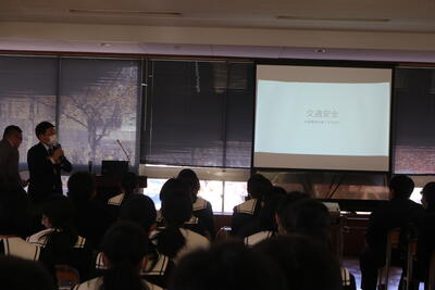 令和5年11月28日(火)の定期考査最終日に、交通安全講話が大河原警察署交通課の警察官を招いて、岩沼高等学園キャンパスさんと合同で行われました。講話では、将来自動車免許を取得したときに注意すべきことや自転車利用の際に注意すべきこと、また、電動キックボードの利用についても詳しくお話をいただきました。また、学校周辺で事故発生が多く、気をつける場所などの指導も受けました。かつての教え子が現在の教え子に講話する様子はとても微笑ましかったです。