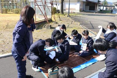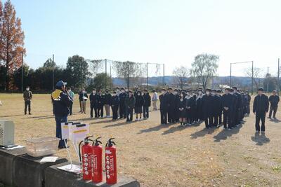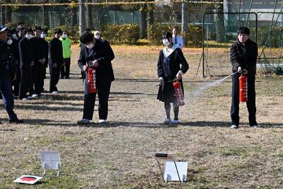 地震発生後、校舎内で火災発生→校庭に避難し点呼→水消火器で消火訓練