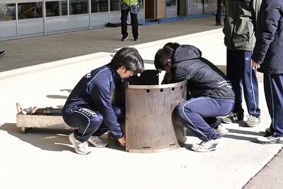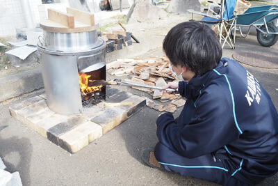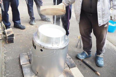 防災鍋・かまど・羽釜を借りて豚汁と塩むすびをつくる。