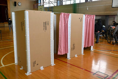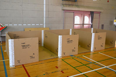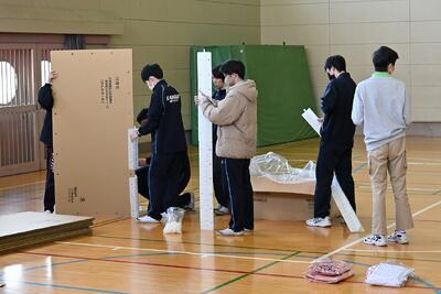 体育館に段ボール製の避難者用間仕切り・更衣室・ベッド・受付設営
