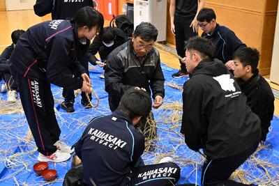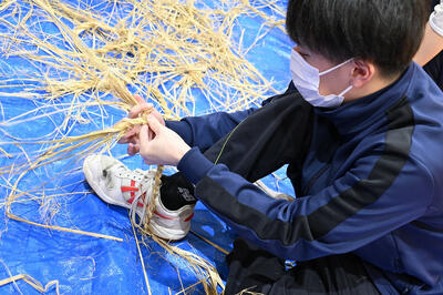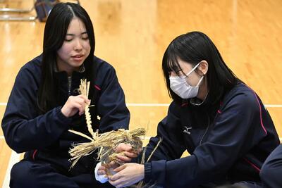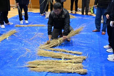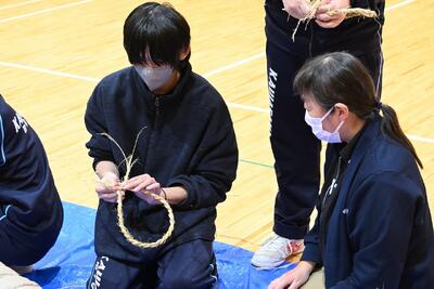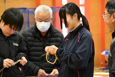 12月4日(木)3年生中心に川崎町社会福祉協議会、立野地区黄金会の方々を講師として招きいて、しめ縄の由来や何故に正月飾りを飾るのか、実践としてご指導をいただきました。