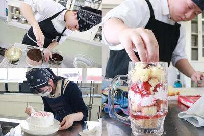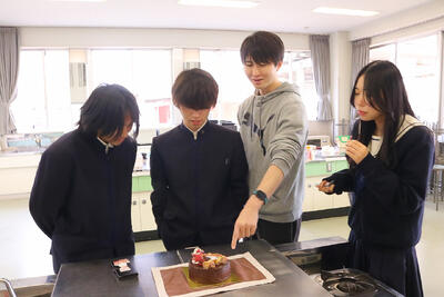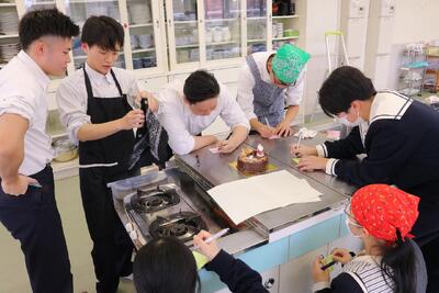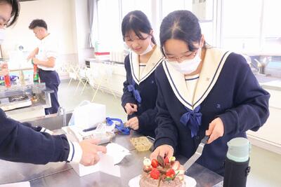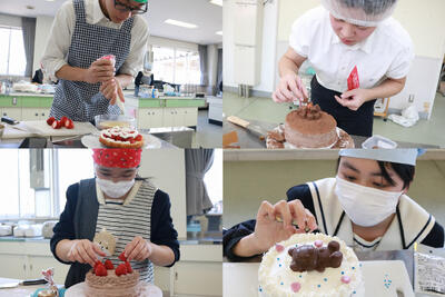 12月と言えばクリスマス! 3年生選択科目「フードデザイン」では、毎年デコレーションケーキづくりコンテストを開催しています。今年は限られた予算の中で工夫を凝らしたデザインと、スポンジケーキやクリーム・フルーツなどの組み合わせを美しく装飾したケーキ作成に取り組みました。