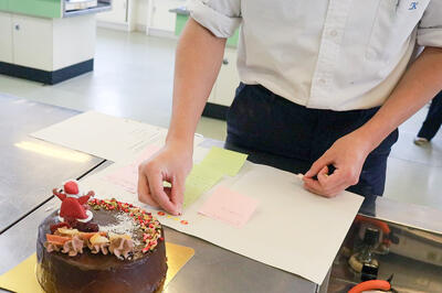 クリスマスを前に、デザインと技術を駆使したデコレーションケーキができあがりました。評価は生徒たちがお互いに評価し合い、技巧を凝らした個性あふれるケーキをじっくり吟味しました。クリームを絞る技術やデザイン、色合いなどを基準に評価を行いました。